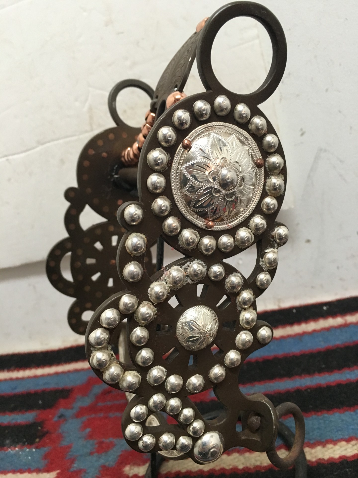 EL GATO SPADE BIT: Unusally deisgned EL GATO marked bit from Mr. Bob McBride. He has been designing and selling the El Gato bits for over 30 years. This one has over 120 pieces of silver, copper rollers on the braces, 3 3/8" spade, 6 1/2" cheeks, 5 1/8" mouth. Excellent condition! We pay shipping within the 48 states. We accept most forms of credit card, Pay Pal, money order, check.