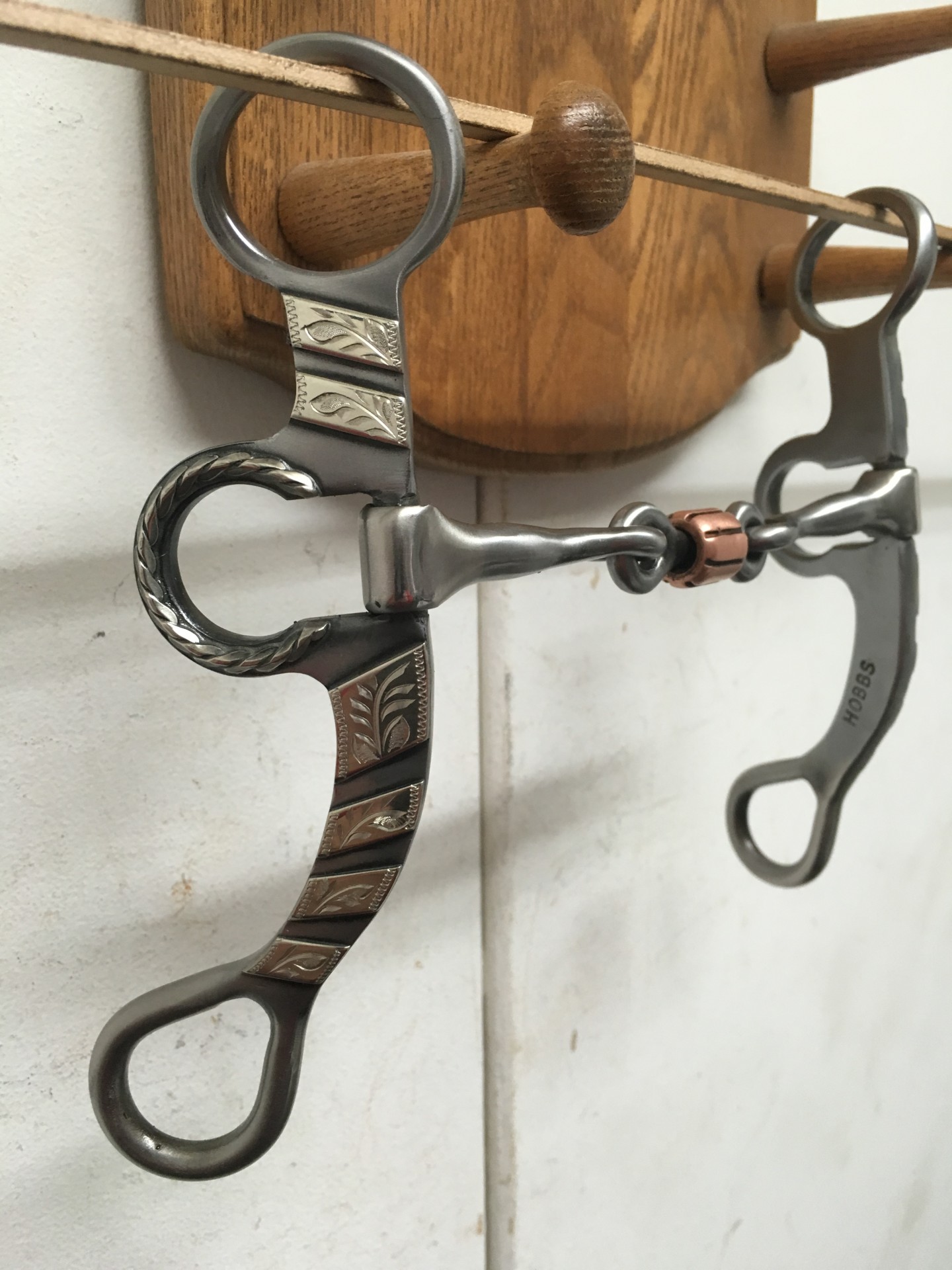 Quality Mick Hobbs made bit that is marked HOBBS 4818, with 6 5/8" cheeks, coppered inlaid 5 1/4" mouth, 14 pieces if mountings. Popular using style. We pay shipping within the 48 states and accept most forms of payment.