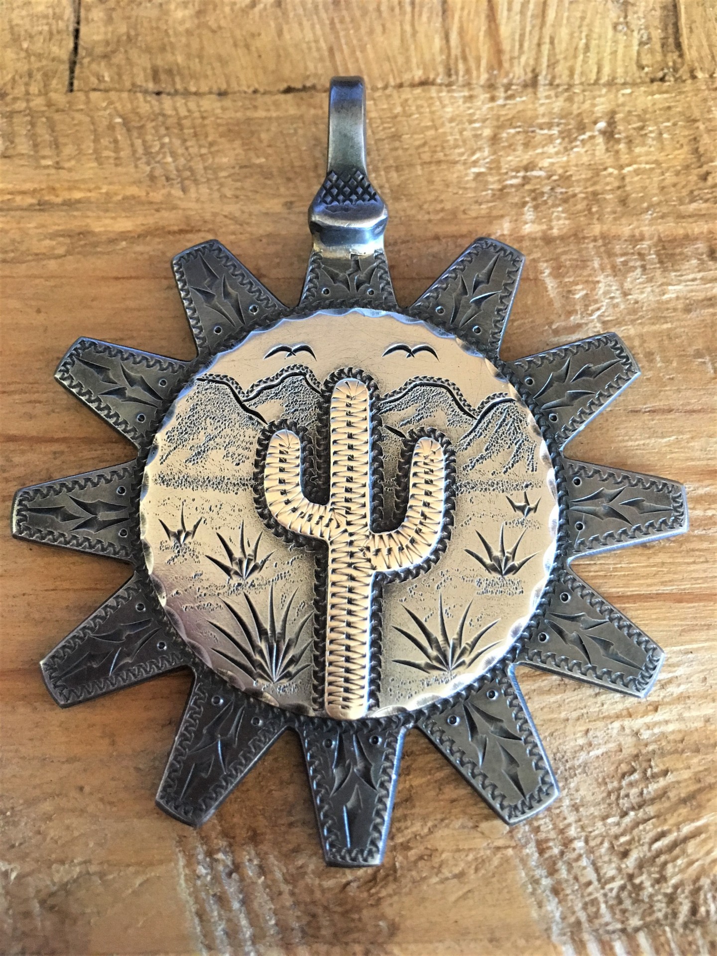 New handmade spur rowel pendant by AZ spur maker JD Moss. Large 12-point spur rowel with nickel silver background scene behind a brass saguaro cactus, all fully engraved. Bail is a horse shoe nail. Marked on the back JD MOSS. Ready to wear or add to any collection.