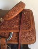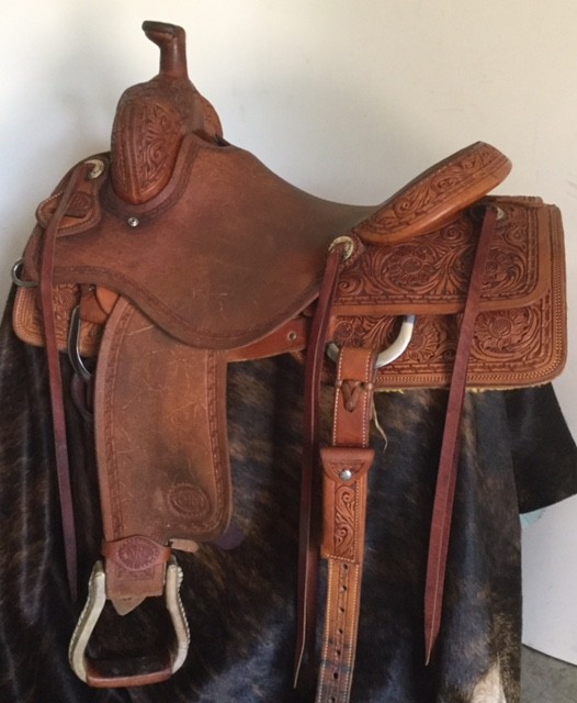 Used 15.5" NRS Competitor Series Ranch Cutter $1100 Half tooled, rough out/floral/barbwire border, QH bars, 3" cantle, 3" horn with 2 1/4" cap, 13" swells, 27" close contact skirts, full double rigging, this saddle is in excellent condition. $1100