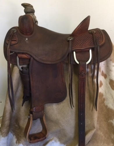 Used 16" NRS Olin Young Ranch Roper $1250 Half tooled, rough out/windmill/rope border, 6 3/4" gullet, Arizona bars, 4" cantle, 14" swells, matching breast collar, 3" Nettles stirrups, does not have a back cinch, Rawhide covered wood tree, in very good condition. $1250