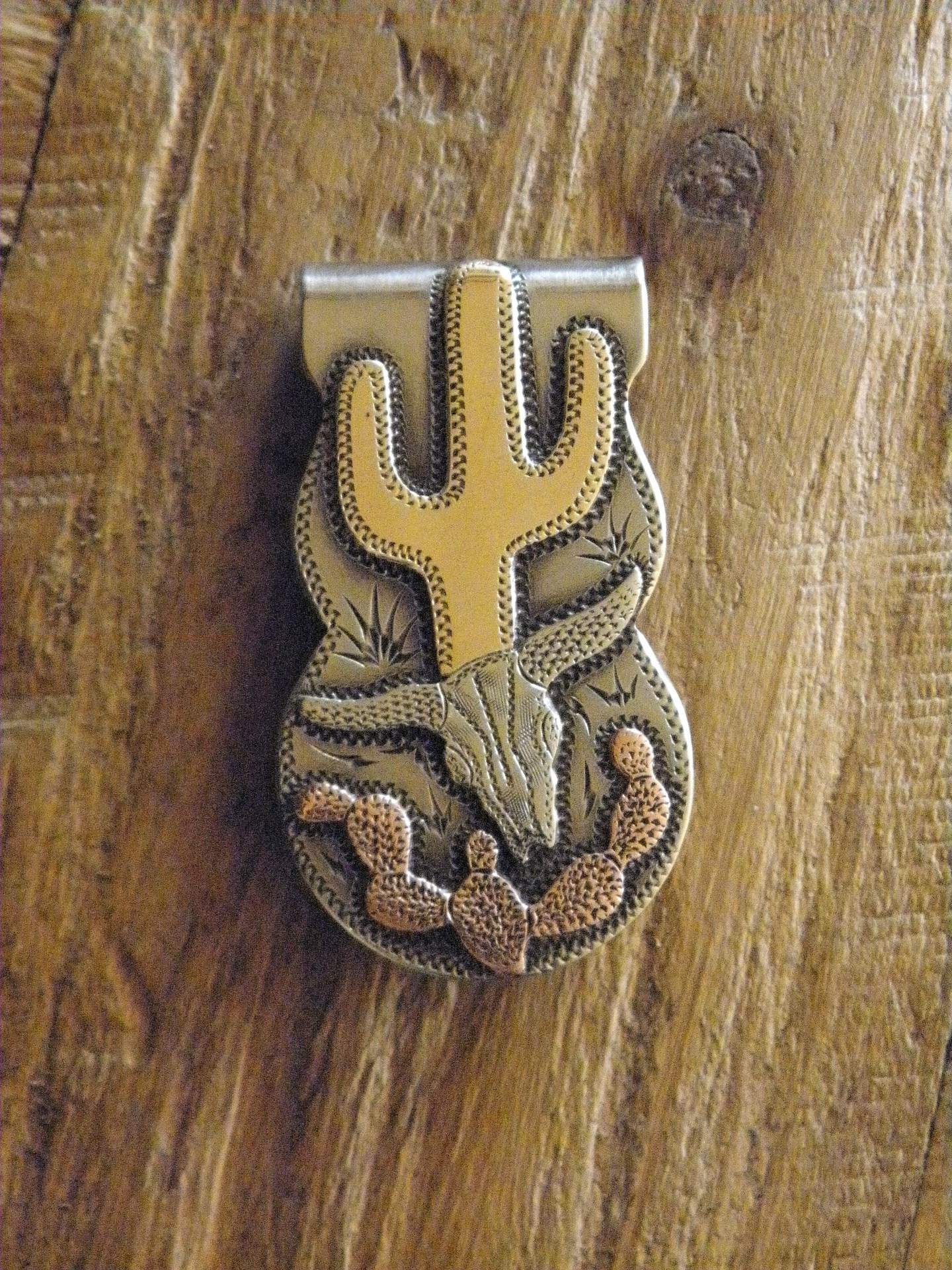 New handmade money clip by AZ spur maker JD Moss. Money clip is solid nickel silver mounted with a brass saguaro cactus, nickel silver skull, and copper prickly pear cactus, fully engraved. Marked on the back JD MOSS. Ready to use or add to any collection.