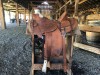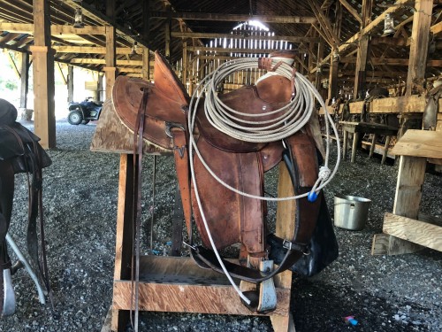 Excellent handmade ranch roping saddle on a wade tree. Perfect dally horn for slick roping. Good ground seat with a deep pocket. Feels very secure on a grumpy horse.