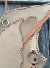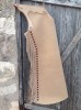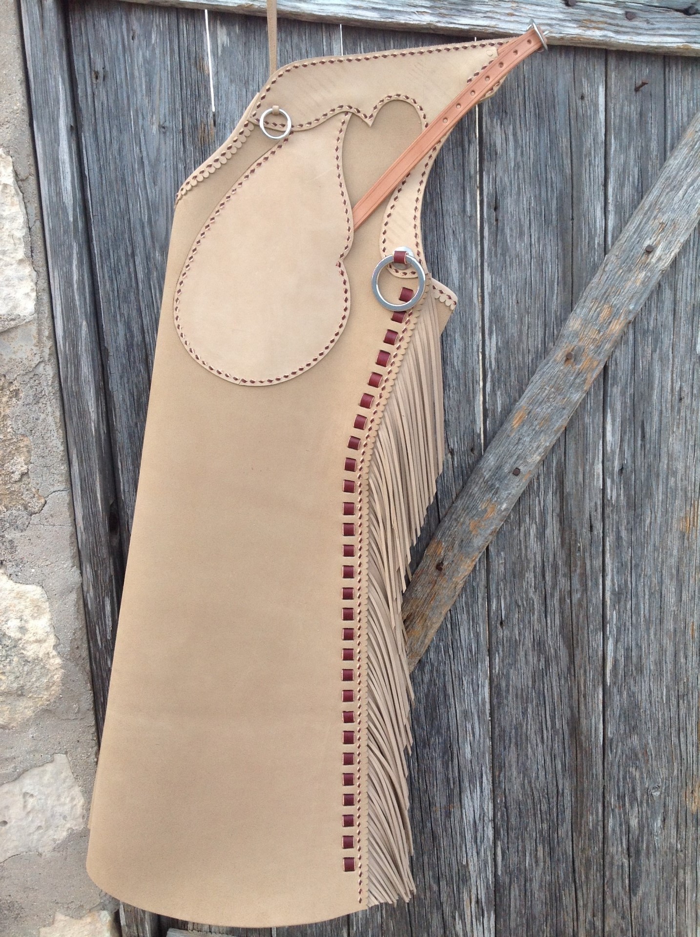 This pair is made from 6-6.5 ounce leather with a lot of body and somewhat stiff. The color is a pale tan. All of the lace is hand cut, split and beveled Indian tan latigo and is roughly 1/8 inch width. There is an outside pocket on the left side and they have long fringe. They measure 40 inches long on the outseam, just under 25 inches in the thigh and 20 inches in the knee. There will be a shipping charge of 15.00. Just call or text with any questions. I don’t answer emails. I’m not taking custom orders anymore but if you have something you need, just let me know and if I build a pair that will suit you I can always let you know. Thank you.