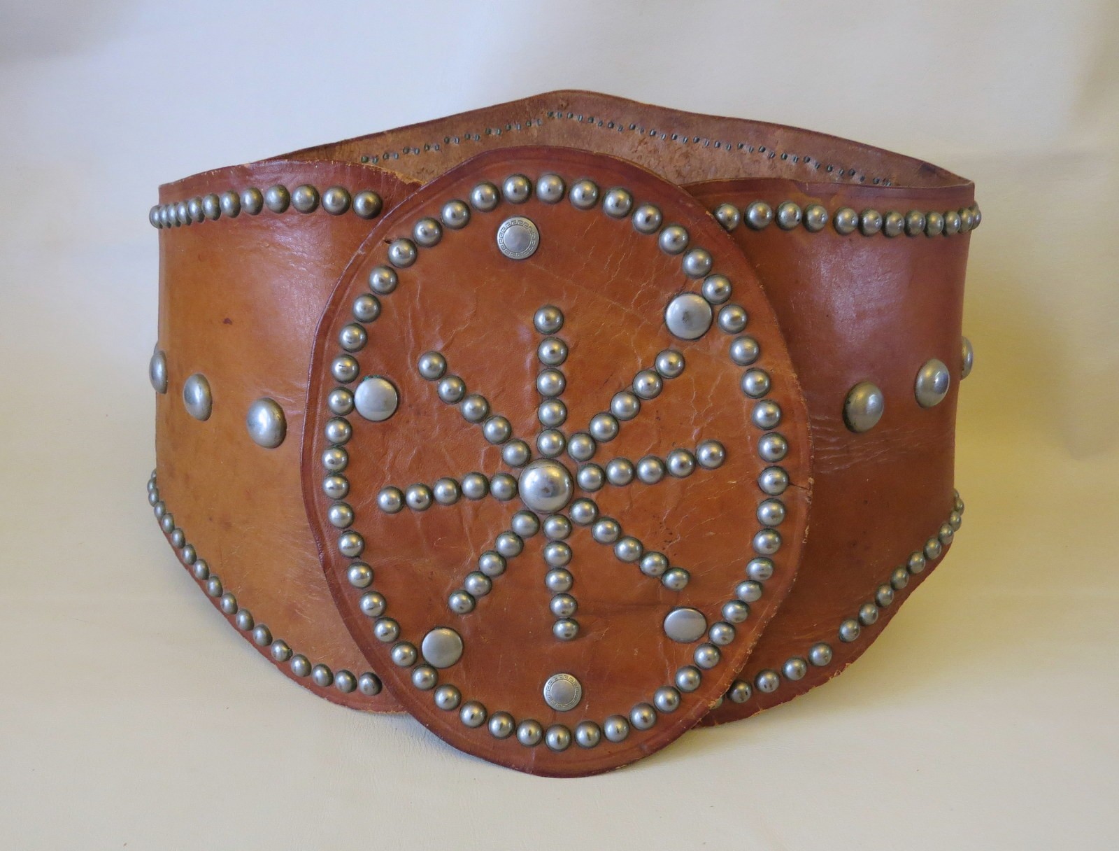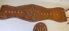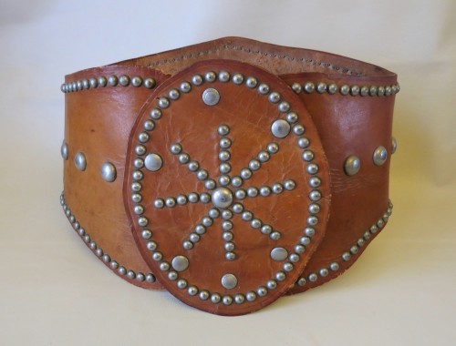 This is a handmade bronc rider belt probably from the 1940’s. This is one of the nicest we have handled. It is not maker marked. These style belts were popular and were inspired by the bronc rider belts. There is an oval piece that snaps on the front of the belt after it is buckled. The leather buckle straps were cracked and were replaced. The back of the snaps are marked as shown in the photos. The condition of the leather is good and it is still flexible. There is minor cracking. We are selling this for display only since vintage leather does not hold up well to wear. It will be up to the buyer if they want to wear it. This would be a nice belt to add to a collection.