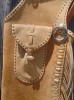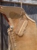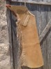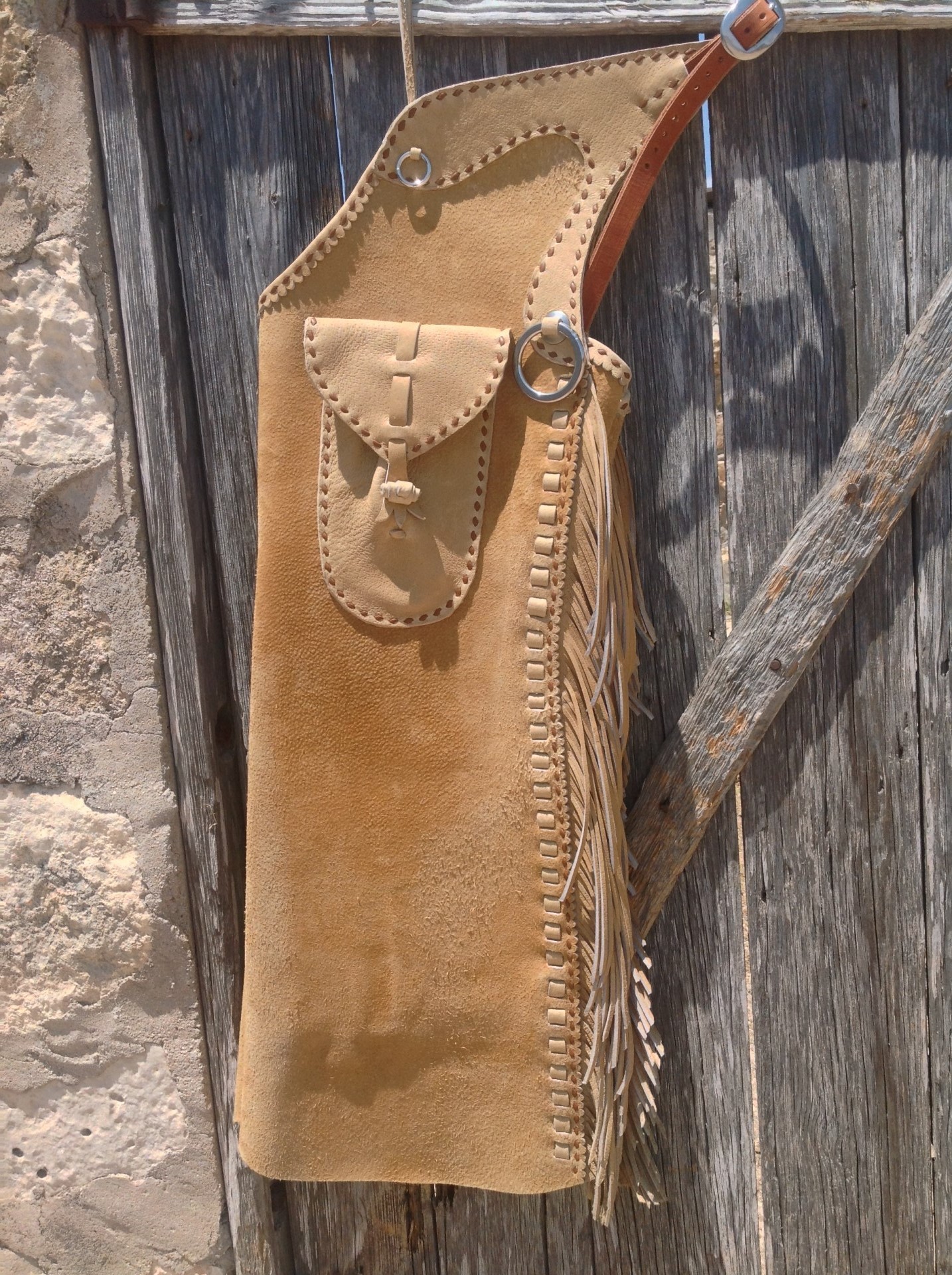 New pair of Gerry Gesell step-in leggins. This pair is made of boars hide and buckstitched with 1/4 inch kangaroo lace, brown in color. Boars hide is the toughest stuff around and will turn just about any thorn in the brush. This pair has fringe, a flap pocket and rolled button on the left leg and an inside pocket on the right. They are stout and heavy. This pair measures 38 inches long, 24 inches in the thigh and roughly 19-20 in the knee. Call or text with any questions. I’m not taking custom orders but if I can and have the leather, I might be able to build something to fit you. Thank you. 15.00 shipping