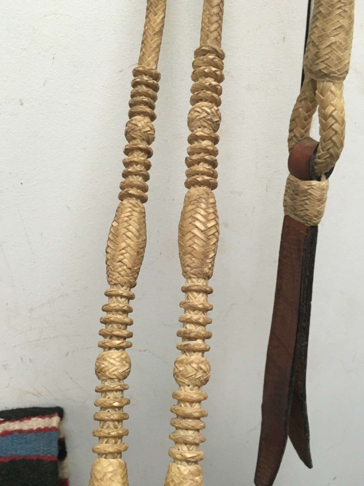 These were purchased new close to 20 years ago at one of the big horse shows. No makers mark, lightly used and have hung in a home most of the time. ANN stamped in the leather. 49" reins. Including the popper, the romal is 48". No issues. The man that owns them just remembered that they cost quite a bit of money. We pay shipping within the 48 states. We accept most credit cards, Pay Pal, money order, or check