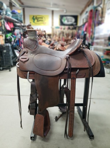 This saddle has a roughout out seat, with a hard seat. This also has crazy leg tooling, and a back cinch.