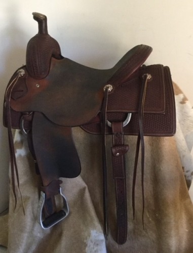 Used 15" Diamond K Saddlery Hard Seat Ranch Cutter $1225. Half tooled basket/rough out/rope border, 27" skirts, 3 1/2" horn w/ a 2.5" cap, 3.5" cantle, 7" gullet, Full QH bars. Shop built on a naturally dried rawhide covered hardwood tree. $1225.