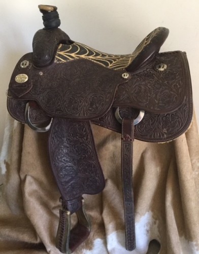 Used 15.5" Paul Taylor Custom Team Roping Saddle $850 Full tooled, unique spiderweb stingray seat, built on a low TM tree, 7" gullet, Full QH bars, 7/8 rigging, heavy S/S hardware, real wool fleece, upgraded Cactus conchos, 27" skirt, in very good condition. $850
