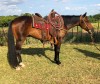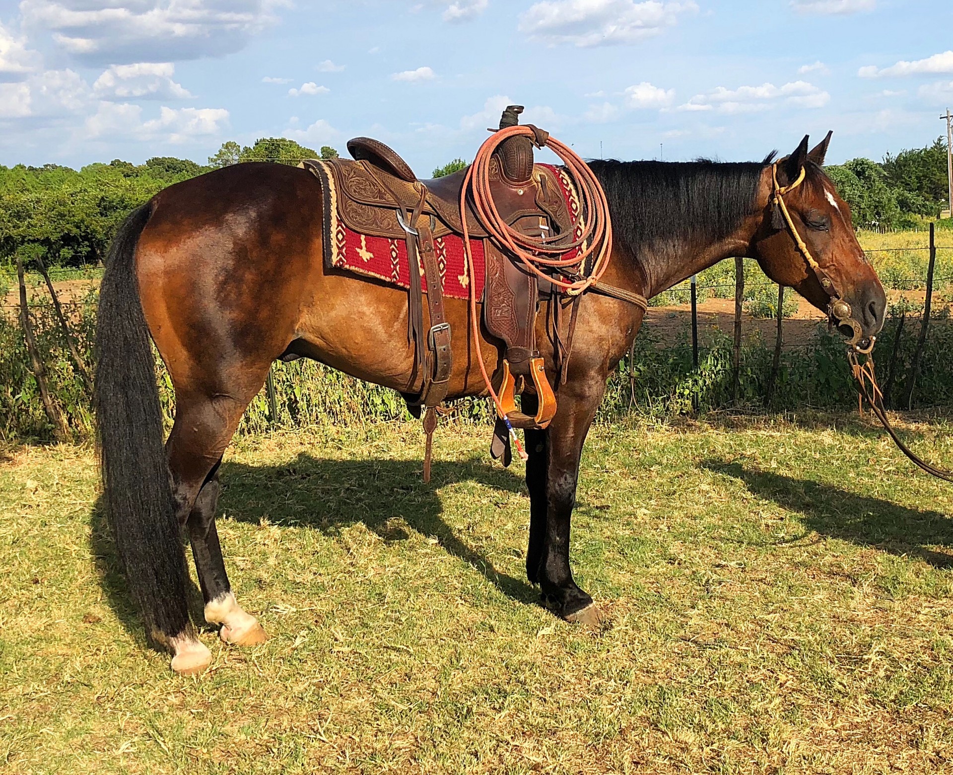 Emmitt is the coolest little gaited ranch horse you’ll find anywhere. He’s quarter horse/Rocky Mountain cross. He’s been used on a big ranch by an older man to do all daily ranch duties including gathering, penning, dragging calves to the fire, doctoring sicks and loading trucks. He’s awesome to go prowl pastures on. He can really stroll and is so comfortable for a person that has a bad back or just needs an ultra smooth horse. He will gait or you can push him up and he’ll lope. He goes over the bridges, through water and anywhere you need him to. He’s really broke and neck reins and is very pleasurable to ride anywhere for anyone. You don’t have to be an experienced rider to get along with him as he is very safe, sane and gentle. He rides bareback as good as he does with a saddle. He’s the coolest trail horse you could ask for and has been ridden in Eminence Missouri, in Palo Duro Canyon and in the Colorado and Kiawamichi mountains. He always has a good attitude about being ridden. To top it off he’s absolutely adorable to look at. Emmitt doesn’t have any bad habits or vices. He stands for the farrier, ties, bathes, loads and hauls.