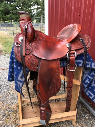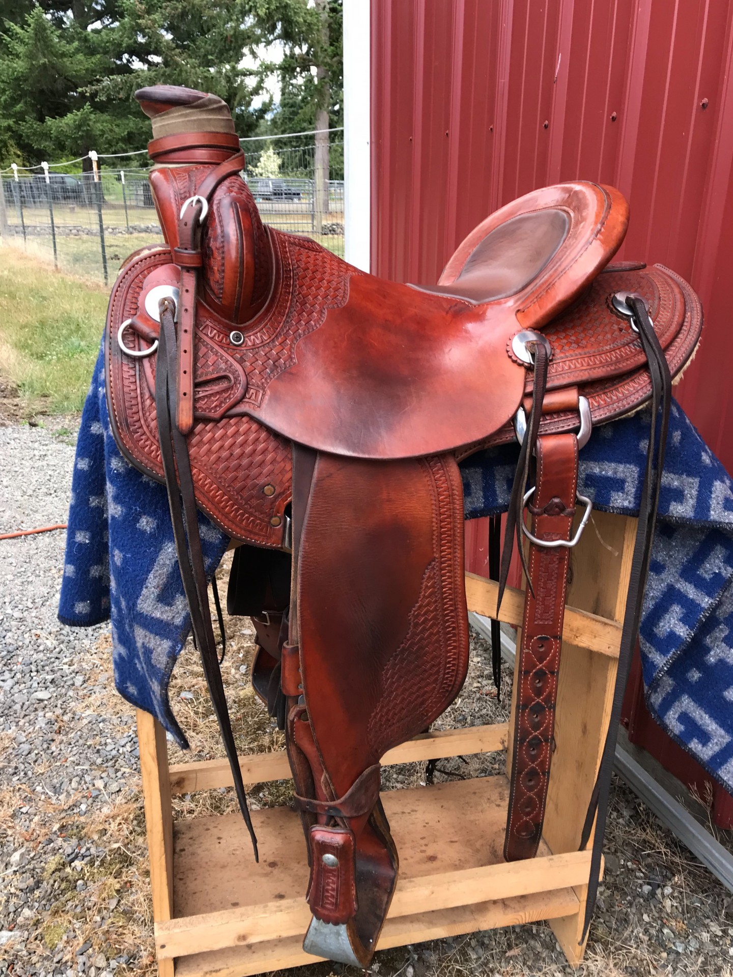 15” seat, feels bigger. Built on Lady Wade bars. Swells provide more security than the Wade style. Beautiful basket weave tooling, slotted conchos with saddle strings, clips and dees for attaching saddle bags. Very comfortable padded, inlaid narrow seat for all day riding. Fits a wide variety of horses. Rope strap, hobble ring, twisted stirrup leathers, mulehide wrapped horn. 8.25” gullet, back cinch, 3” rawhide bell stirrups. Excellent workmanship, quality leather. Saddle has been broken in but taken good care of and has no problems. Mostly trail/mountain arena miles. Seat puts you in a perfect equitation posture for ease of riding. Can’t say enough good things about this saddle. More pictures available for the asking. Happy to ship and use paypal but we would need to negotiate the costs.