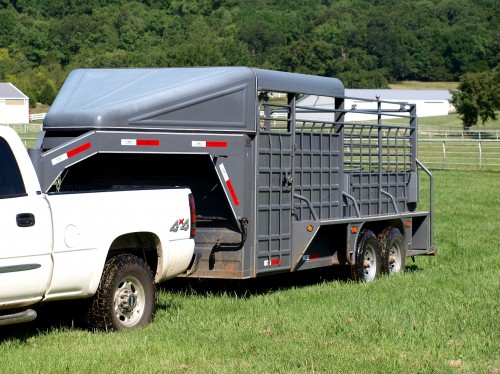 Floor mats, rear swing with slider, cut gate, slam latches on both. Good tread, pulls good, LED lights all work, brakes are good.