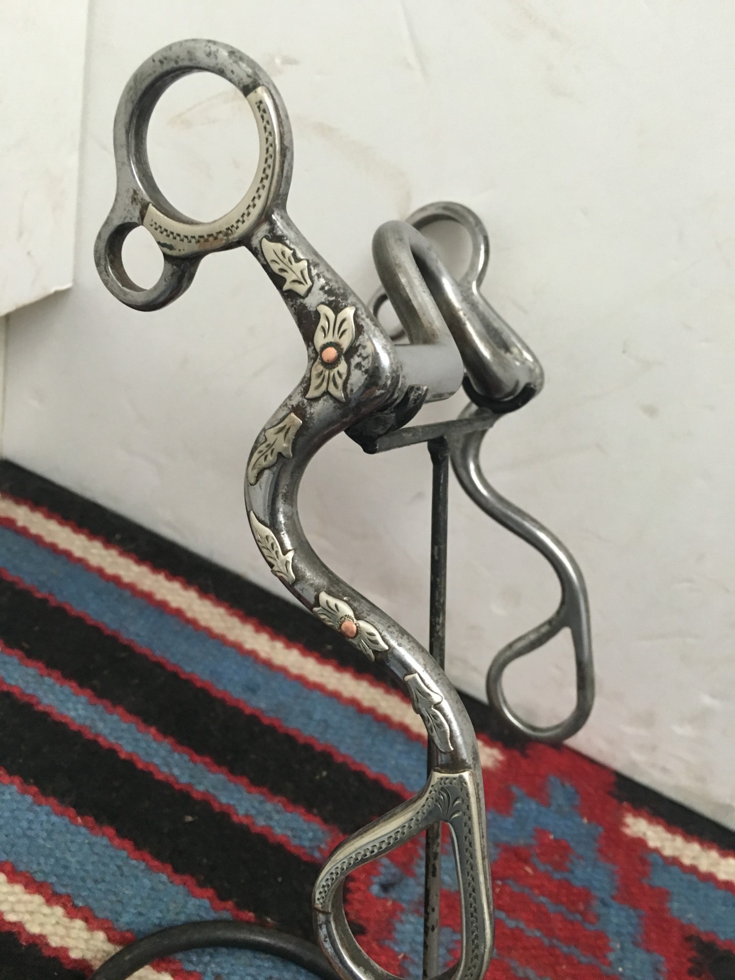 Lightly used early made KERRY KELLEY bit with flower mounted 6 7/8" cheeks and copper inlaid 5 1/8" mouth. This is one nice bridle bit by one of todays most popular makers. We pay shipping within the 48 states and accept most forms of payment.
