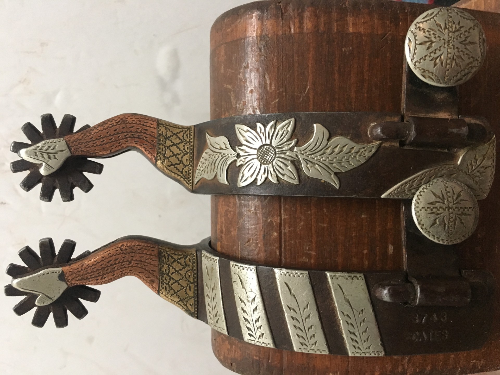 Good pair of gal leg spurs by the late award winning maker Jerry Cates. Marked CATES 3743. with 1" bands, 3 3/16" heel openings that can be spread, 1 1/4" rowels, 2 1/4" shanks, silver brass copper mounted. Very collectible pair of spurs by one of the legends of Texas style spur making. Just a little play in the rowels. We pay shipping within the 48 states and accept most forms of payment.