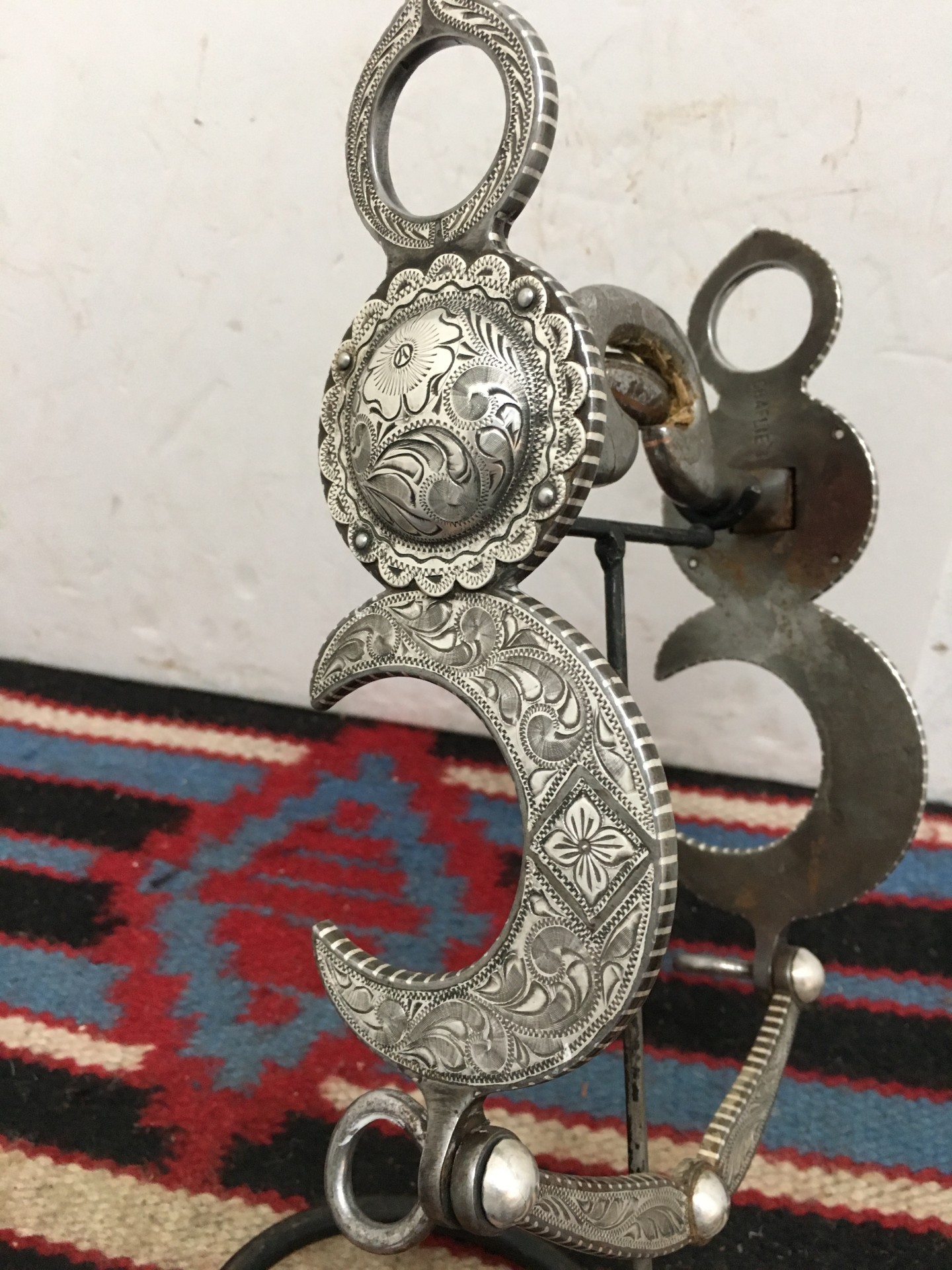 Lightly used 1/4 moon bit with 7 1/8" cheeks and a 5 1/8" frog mouth that is copper inlaid. Bit is marked CHARLIE’S and was private labeled for Charlie’s by the artisian that made it in Mexico. Real silver inlaid, very useful bit with a lot of eye appeal. It will get brown with use. We pay shipping within the 48 states. We accept most credit cards, Pay Pal, money order, check.