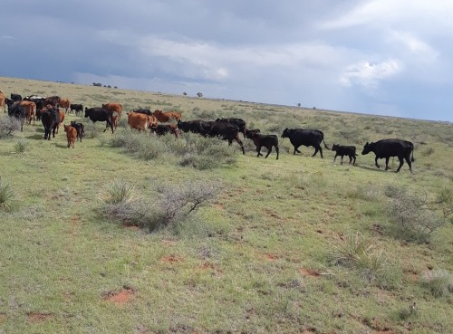 27 pair blacks reds and baldies with a touch of ear on part of them with the rest being good English cattle. All but one are muleys. Calves are from 100 to 300lbs all have been vacinnated with inforce and 7way. Cows have been running back with Angus bulls. This set of cows are easy to handle and cake broke.