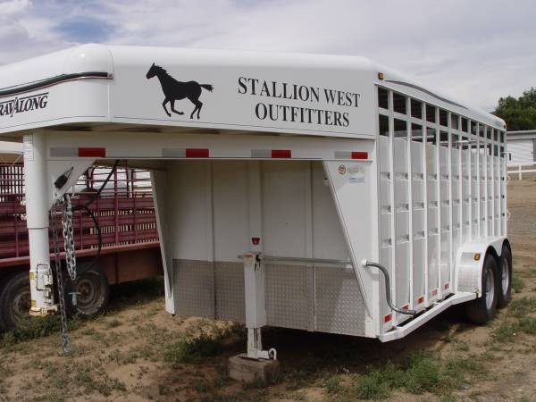 SUPER CLEAN GOOSENECK STOCK TRAILER 16’, ONE OWNER, ONLY PULLED A FEW TIMES, FLOOR IN GREAT SHAPE! HAS ALMOST NEW RUBBER FLOOR MATS! TIRES ARE 235-80-R16 HAVE 90% TREAD LEFT TOO! CLEAN TITLE! EZ-LUBE HUBS, DUAL AXLE, 8 LUGS, GVWR 14118, HAS RUBBERIZED KICKWALL ALL THE WAY AROUND. INCLUDES SPARE.