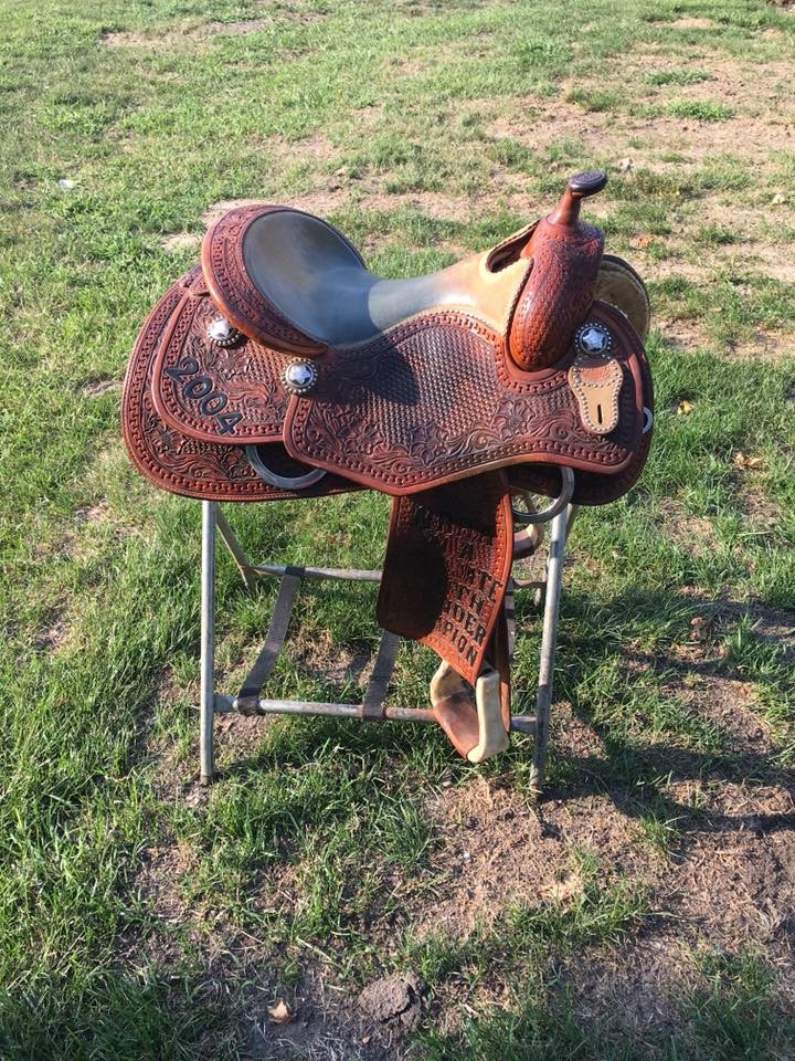 16 inch Teskey’s Reining Saddle - Full QH Bars. Beautiful tooling on the entire saddle. Was won as a Youth saddle. Saddle has been cleaned frequently and when not on a horse it has been stored in a padded saddle bag. Very comfortable seat and nice to ride in. Has fit all my horses well. Tooling is a floral pattern. Heavy built saddle.