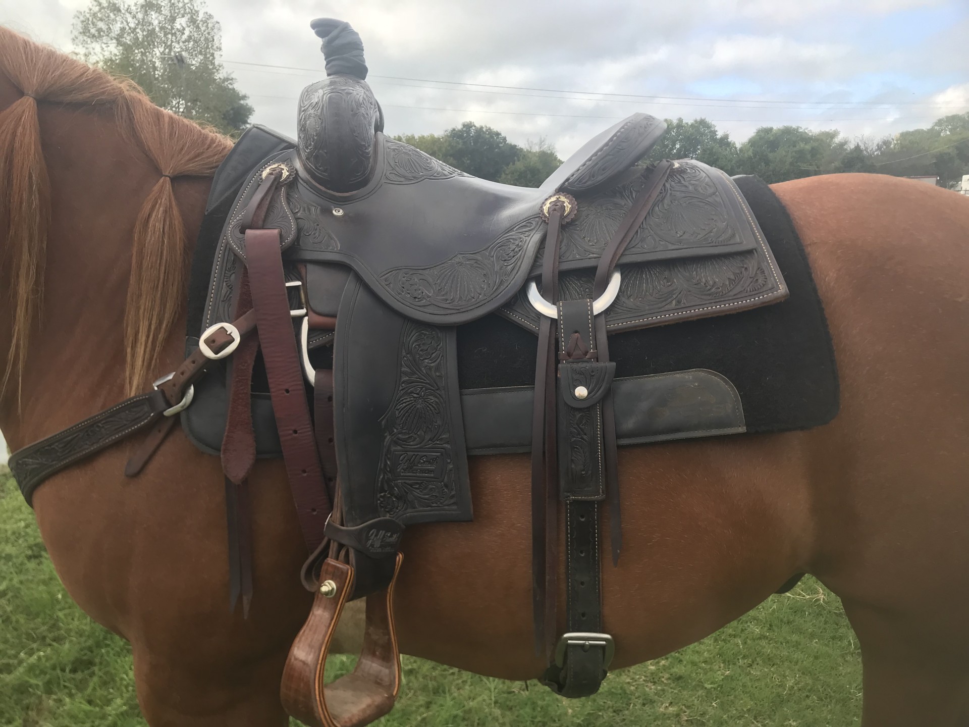It has the Buster Welch Ranch Cutter tree with a 6.75in wide gullet, 27in skirt length, gorgeous dark chocolate in color, has poinsettia floral tooling, matching tooled contoured breastcollar & Don Orrell Walnut Offset Stirrups! It’s been conditioned 3x with Skidmore’s Leather Conditioner since I got it a year ago.