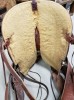 This round skirted saddle is made up of all smooth, basket stamp tooled leather. Finished with a rawhide cantle and horn, as well as saddle strings. Comes with a back cinch.