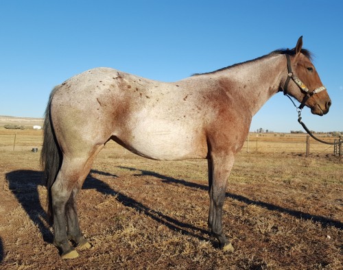 Gorgeous well-built bay roan 2 yr old mare, Hancocks Playboy Rey, with all the looks and ability to get the job done PLUS she is Ranching Heritage Eligible! Started with around 60 days on her inside and outside tracking cattle and across the pasture. Guaranteed sound, 15.2 hh and about 1200 lbs, she is still growing!