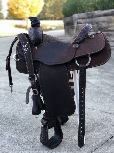 Coats 14 inch chocolate roughout saddle with matching chocolate roughout breast collar and wide flank cinch. Like new.