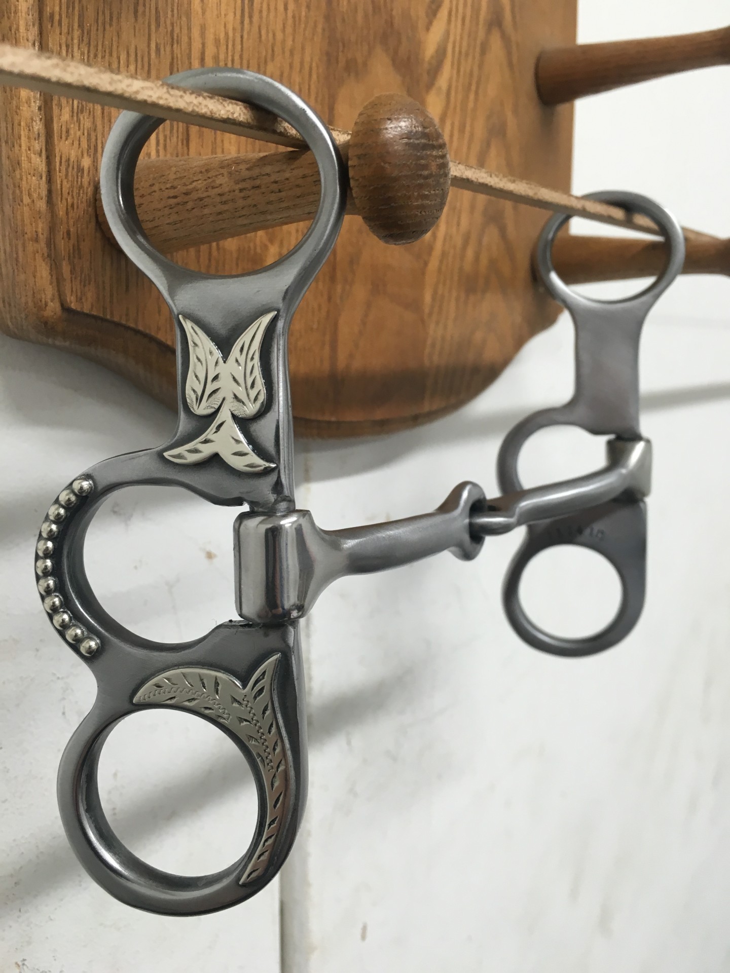 HOBBS 111418 marked bit with copper inlays in the 5" mouth and mounted hand engraved 4 3/4" cheeks. Handy transition bit of good quality by a long time maker. We pay shipping within the 48 states and accept most forms of payment.