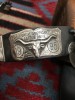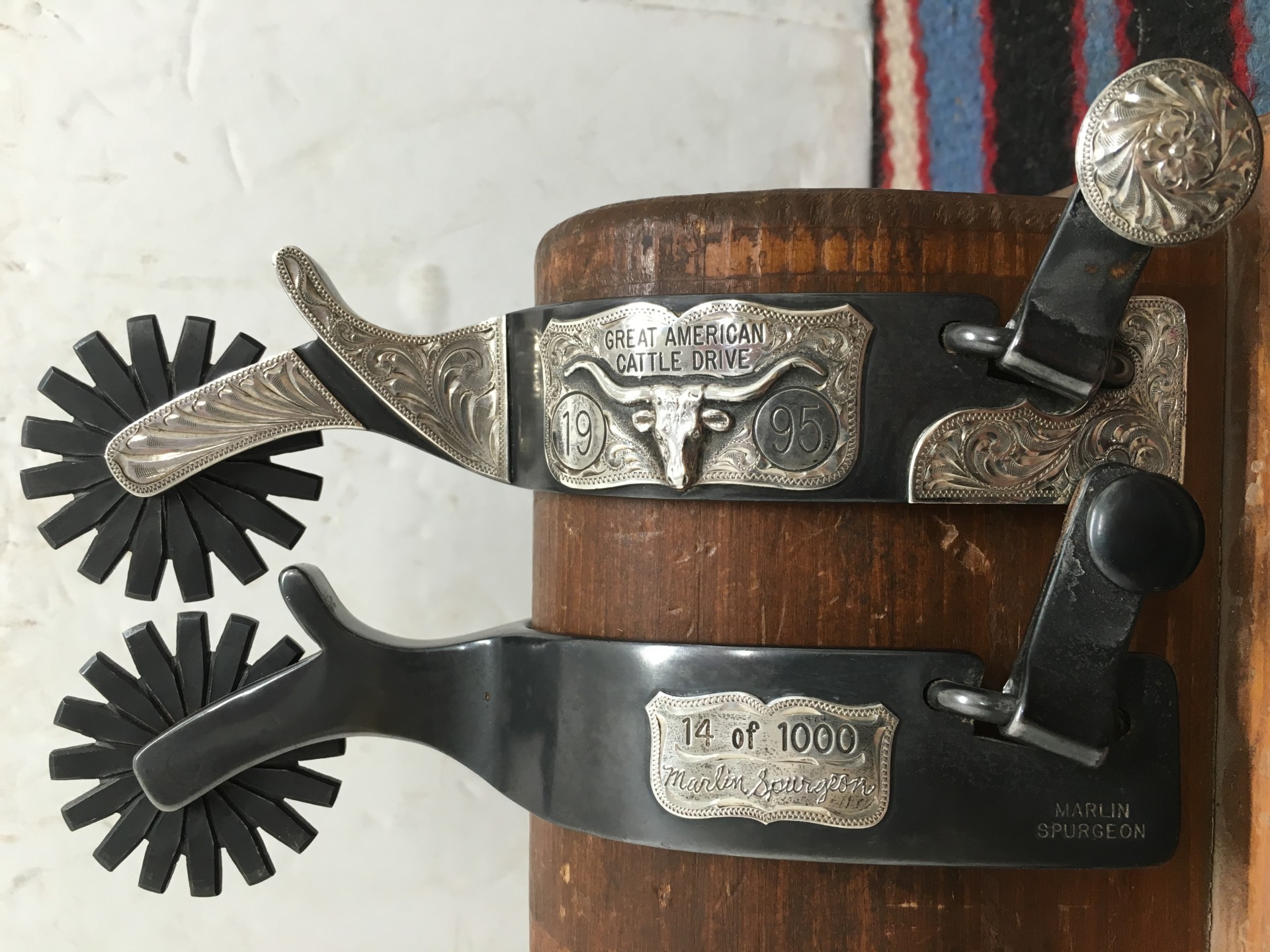 Limited addition spurs made by the late Marlin Spurgeon to commenerate the 1995 GREAT AMERICAN CATTLE DRIVE. This was a historic event and can be researched. This pair is 14 of 1000, maker marked, sterling mounted, unworn. 3 1/4" heel openings, 1 1/8" bands, 1 3/4" rowels, and 2 1/2" shanks. Great addition to many collections. We pay shipping within the 48 states and accept most forms of payment.