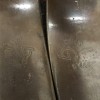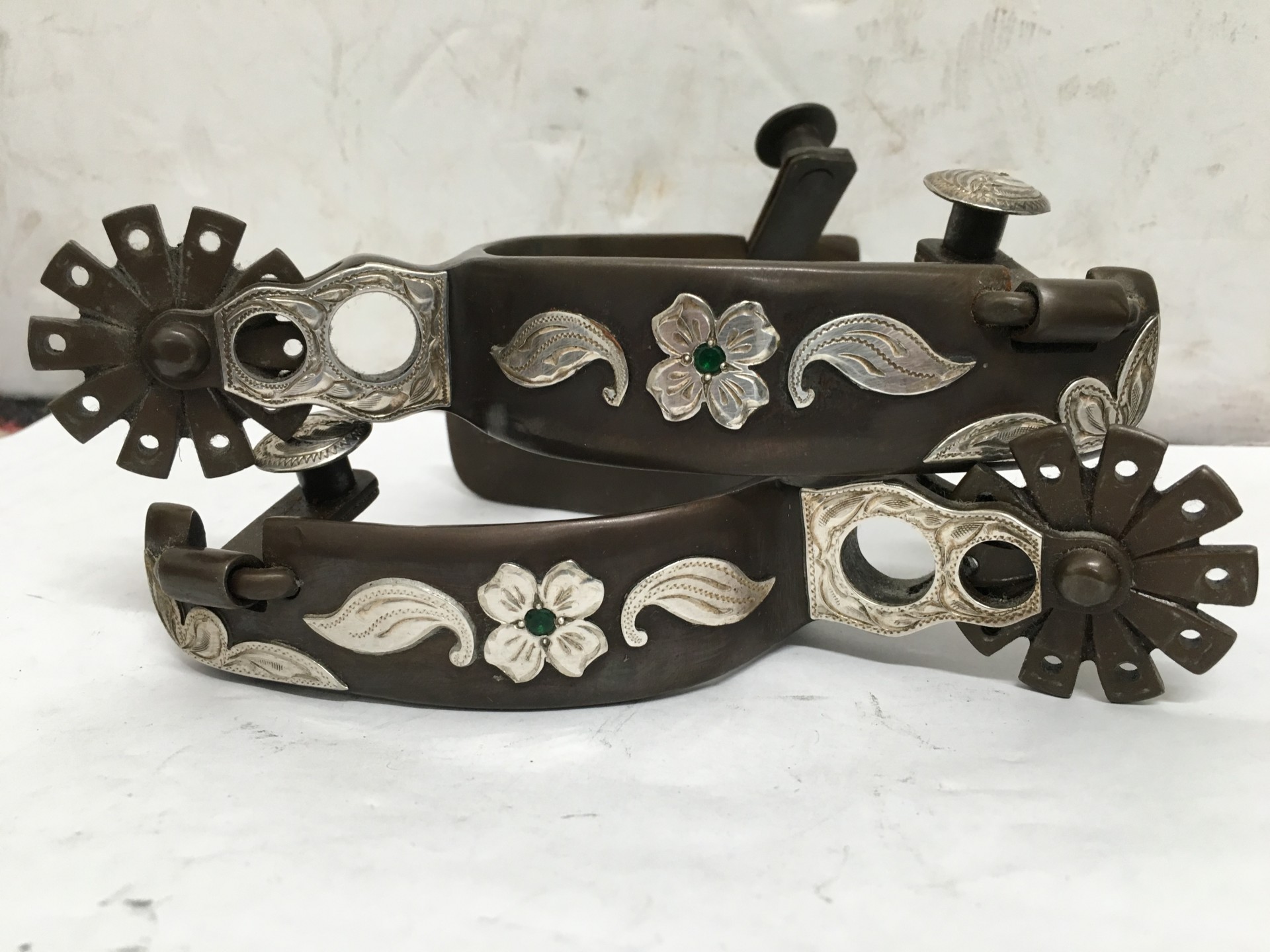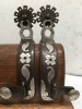 sale pending---Unworn spurs marked WES GRIFFIN 001 03 03. Wes is a long time Texas maker and he put much work in this pair rounded and smoothing the edges and hand engraving the silver overlays. The overlays polished and look like sterling. Really smooth workmanship. 3" heel openings that can be widened, 1" bands, 1 7/8" shanks, 1 1/2" rowels. Can be opened to fit a lot of men and will fit many lady’s boots as they are. We pay shipping within the 48 states. We accept most credit cards, Pay Pal, money order, check.