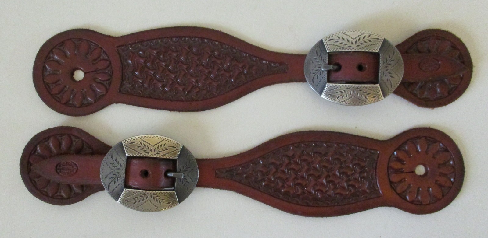 This is a pair of new handmade spur straps with Mike Bednorz spur strap buckles. Mike is a long time bit and spur maker from Dumas, Texas. The buckles are steel and are mounted with engraved nickel silver. There is engraving in the steel between the mountings. The straps were made by Bob’s Custom Saddle Shop located in Scottsdale, Arizona. This would be a nice pair of straps to wear.