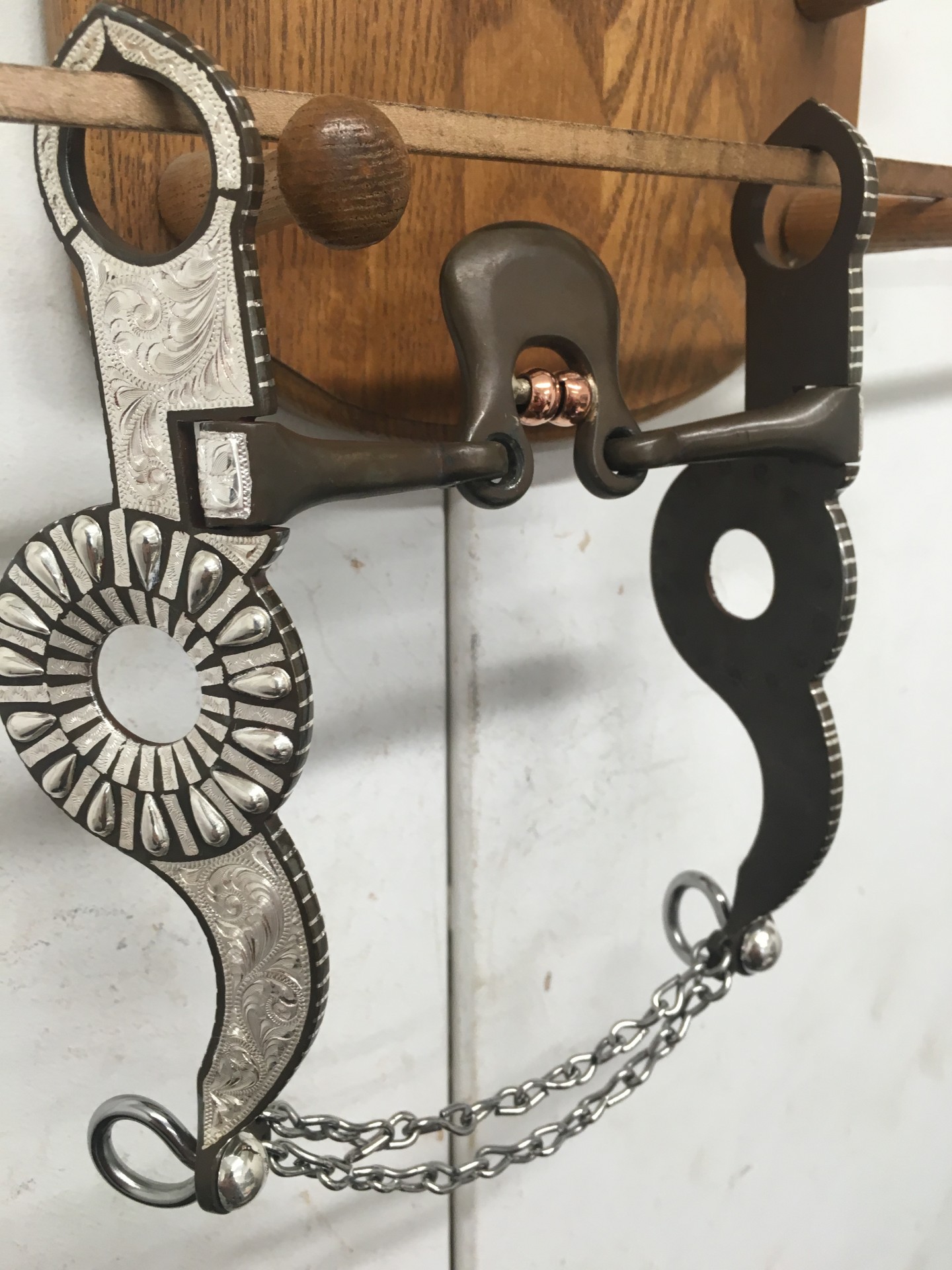 Floating spoon bit in unused condition marked CHARLIE’S, with 7 3/8" cheeks and 5 1/8" mouth. Quzlity done steel and silver work. Made for Charlie’s by long time silver and metal cratsmen. We pay shipping within the 48 states and accept most forms of payment.